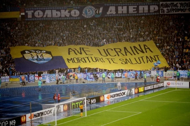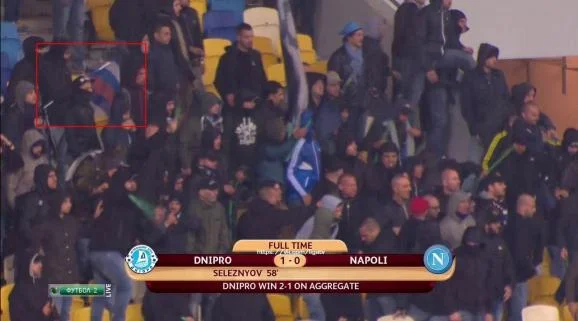 Тема АТО постоянно присутствовала и на поле. Так, на трибунах развернули баннер с логотипом полка "Азов". А среди болельщиков "Наполи" заметили провокаторов - они держали флаг России. К счастью, на провокации никто не отреагировал.