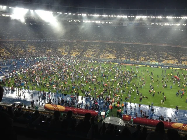 После матча сотни болельщиков выбежали на поле стадиона "Олимпийский". Часть из них попыталась атаковать трибуны с фанами "Наполи". Но большинство просто радовалось победе.