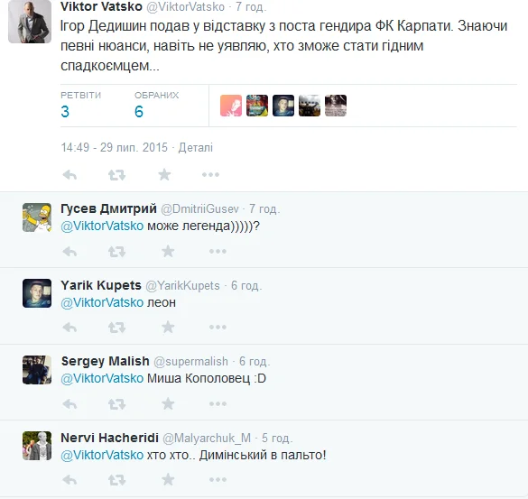 Игорь Дедишин подал в отставку с поста гендира ФК "Карпаты". Зная определенные нюансы, даже не представляю, кто сможет стать достойным наследником...", - написал комментатор каналов "Футбол1" и "Футбол2".