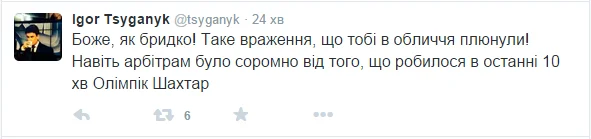 "Боже, как противно! Такое впечатление, что тебе в лицо плюнули! Даже арбитрам было стыдно от того, что делалось в последние 10 минут матча "Олимпик"-"Шахтер", - написал журналист на своей странице в твиттере.