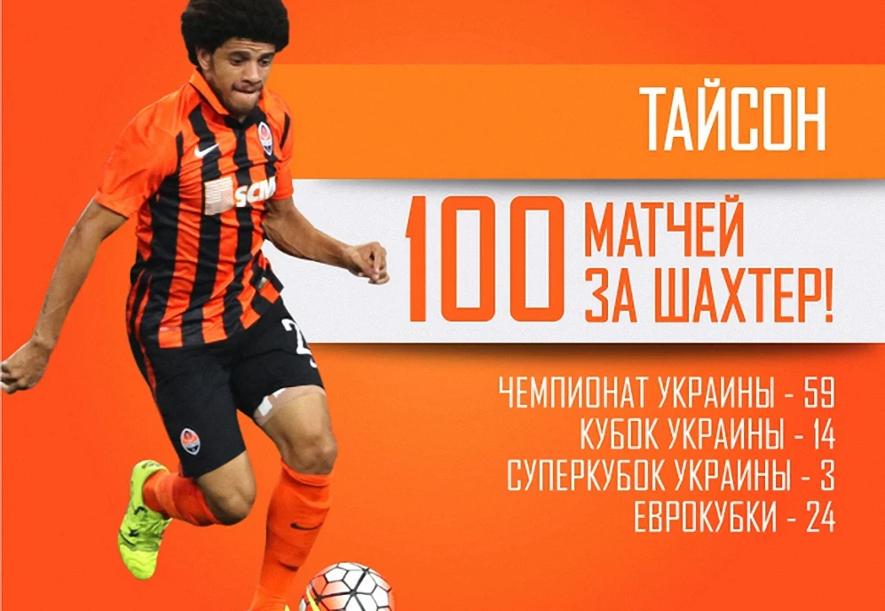 Полузащитник команды Тайсон провел свой сотый матч за "Шахтер" и отличился голом. Бразилец дебютировал за "горняков" в марте 2013 года. За сто матчей в "Шахтере" Тайсон забил 12 голов.