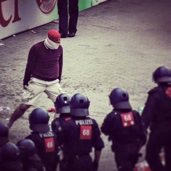 Во второй Бундеслиге снова отличился саппорт "Кайзерслаутерна", который недавно имел стычку с полицией. На этот раз акабы получили численное преимущество, что не испугало храброго "черта", который готов принять бой.