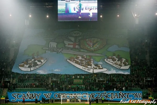 На матче "Шленск" - "Лех" ультрас в очередной раз выступили против засилья мигрантов из стран "третьего мира". Гигантское полотнище призывает встать на защиту христианства.