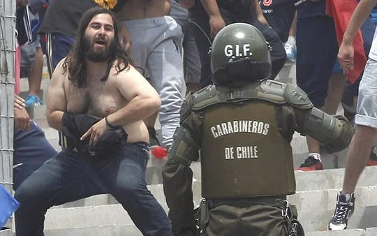"Коло-Коло" - "Универсидад де Чили". Фанат непонятной ориентации (футбольной, конечно же) против вооруженного акаба.
