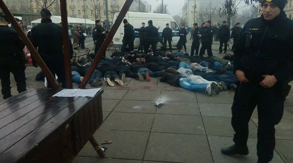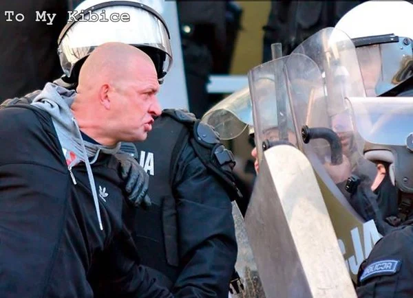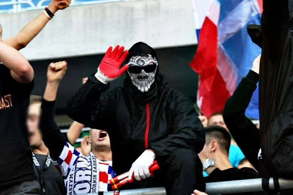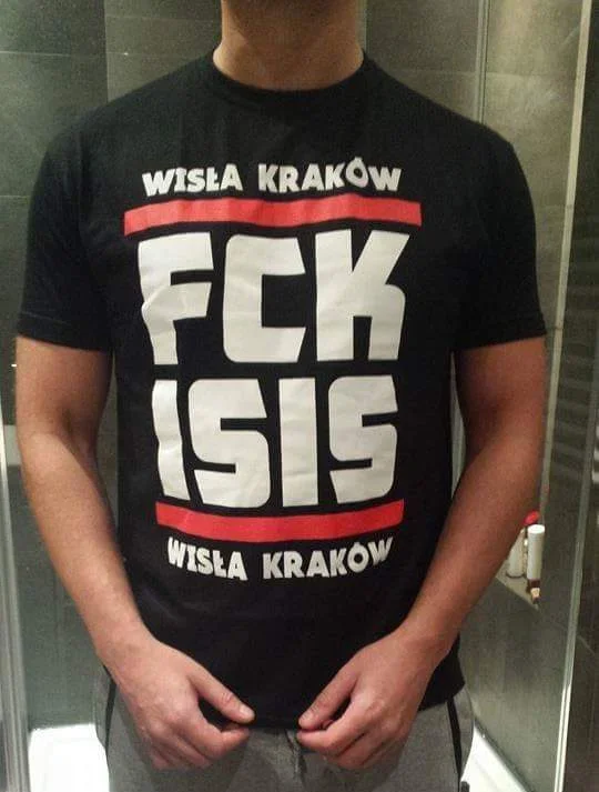 Кибиц краковской "Вислы" так "храбро" бросает вызов ИГИЛ, что даже спрятал лицо. Или это у фотографа руки не из того места выросли?