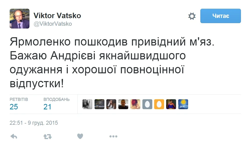 Виктор Вацко сообщил, что Ярмоленко получил травму приводящей мышцы. А также пожелал скорейшего выздоровления.