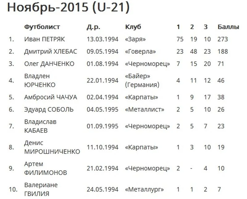 Петряк заработал в ноябре 273 балла в рейтинге "Золотой талант Украины". На втором месте расположился форвард "Говерлы" Дмитрий Хлёбас, который отстал от Петряка почти на 100 баллов, хотя и показал свой лучший результат. До рекордной для себя отметки добрался и Олег Данченко - переквалифицированный в "Черноморце" с правого полузащитника в правого защитника.
