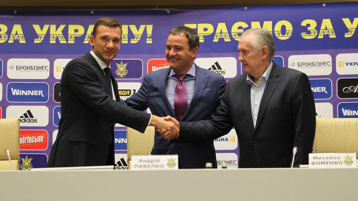 К сожалению, повышенное внимание к Шевченко слегка исказило цель мероприятия – представление тренерского штаба. Все внимание к новому ассистенту, совместное фото – Шевченко, Фоменко и Павелко. Остальной штаб остался в тени главного «ньюзмейкера». Представили по именам, но не сделали общую фотографию.