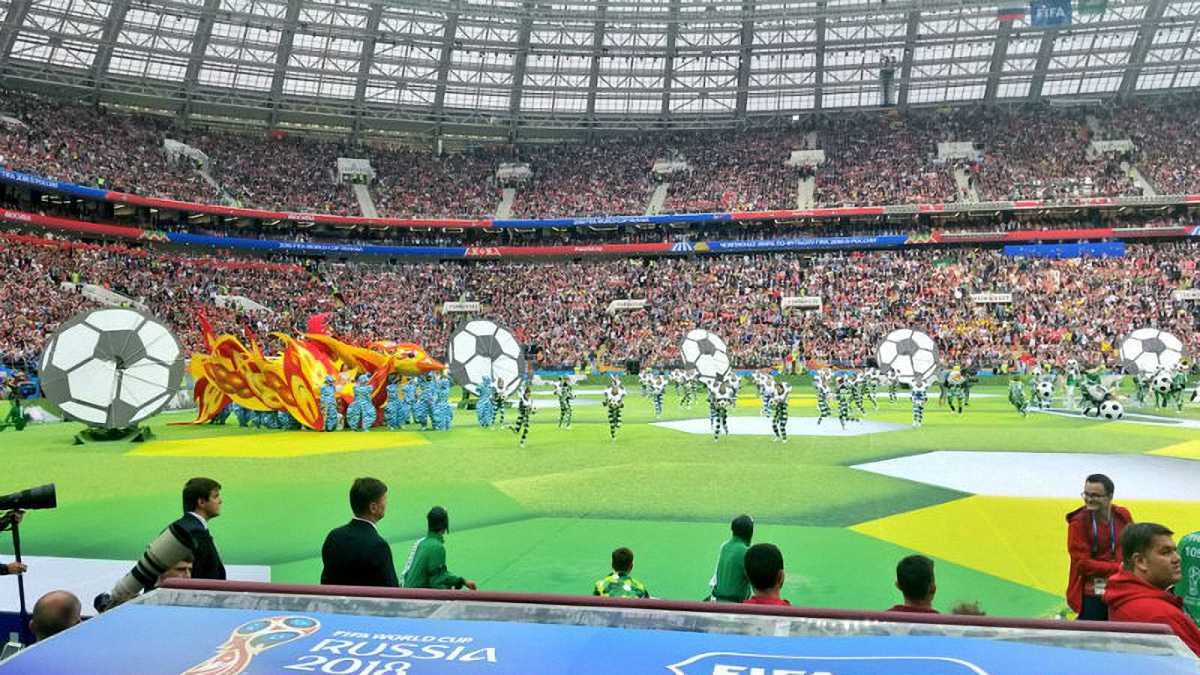 Під час церемонії відкриття ЧС-2018, яка пройшла у Москві перед поєдинком Росія – Саудівська Аравія, на трибунах стадіону Лужники був помічений вболівальник з українським прапором.