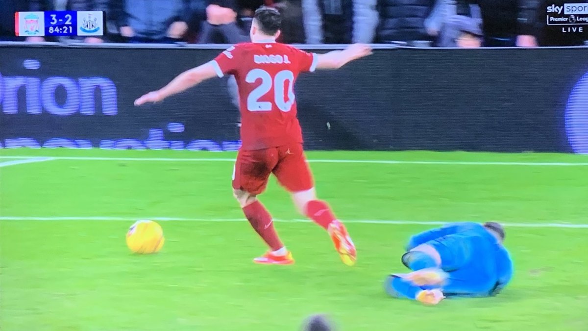 Португалець за рахунку 3:2 обіграв захисника та Мартіна Дубравку і міг забивати у порожні ворота. Утім, Діогу Жота вирішив впасти, а суддя призначив пенальті. Цей момент викликав гнів у англійських експертів.