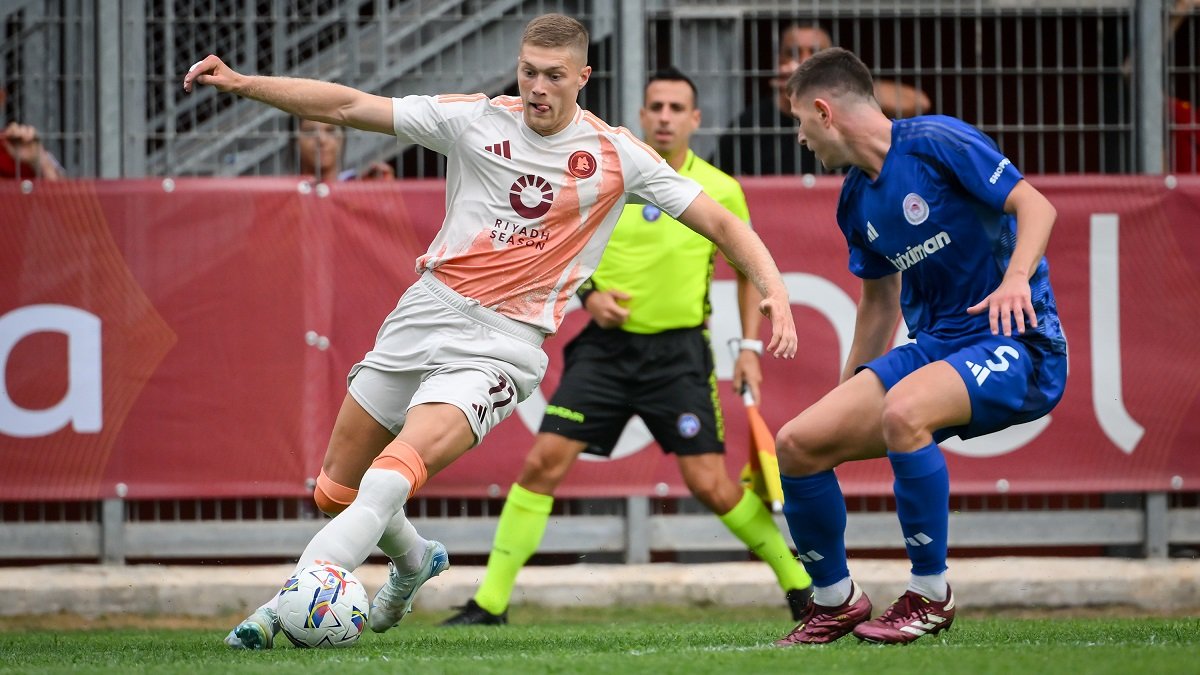 Для Олімпіакоса це був другий спаринг за два дні, тож кадрові можливості були обмежені. Зокрема, Роман Яремчук не грав. У Даніеле Де Россі таких проблем не було. Артем Довбик залишився у запасі. Зі старту почав Таммі Абрахам. Англієць, якого планують продати, і організував перший гол, заробивши пенальті, який реалізував Пеллегріні. Перевага римлян трималася 5 хвилин, коли арбітр призначив ще один пенальті – вже в їхні ворота.