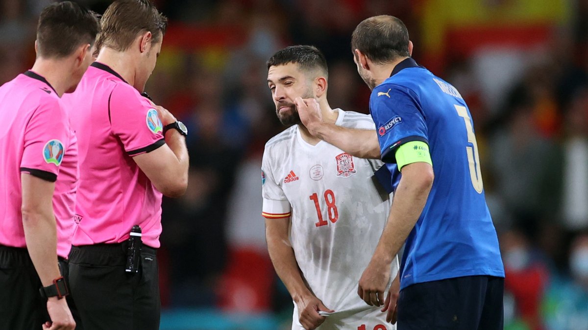 Перша спроба німецького арбітра Бриха виявилася невдалою – К'єлліні та його опонент забули обрати бік монетки. Проте, Жорді Альба почав активно жестикулювати, що його влаштовує бити пенальті у ворота, за якими розташувалися вболівальники "Фурії Рохи".