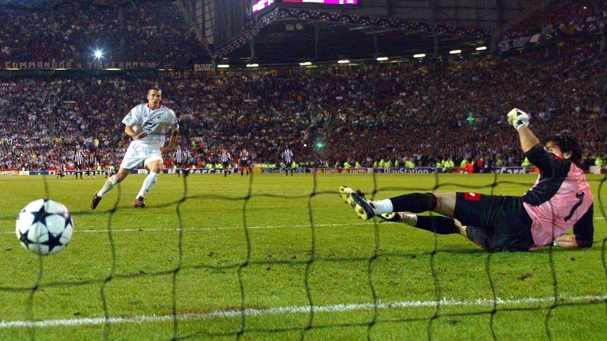 Шевченко встановлює м'яч та відходить для розбігу. Він майже не дивиться не ворота, а спостерігає за арбітром – через шум на трибунах свистка просто не чути. Крістіан Шраєр дає сигнал. Шевченко починає бігти. За секунду до удару Буффон робить невеликий крок вперед та стрибає у правий від себе кут – протилежний до того, куди Шевченко посилає м'яч. Олд Траффорд, Мілан та вся Україна вибухають переможним криком: Шевченко приніс Мілану перемогу у Лізі чемпіонів!