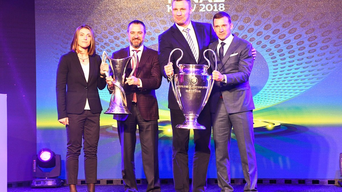 Презентація логотипу фіналу ЛЧ-2018: Шевченко ніжно цілує кубок, а Павелко запевняє, що Київ проведе найкращий фінал в історії турніру
