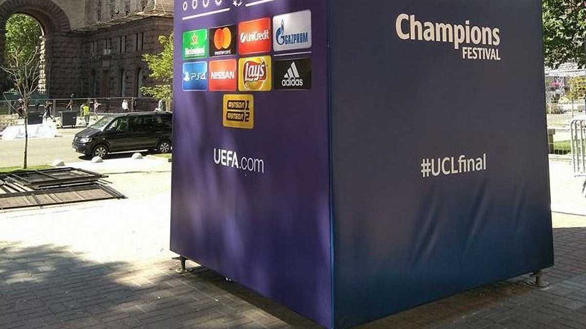 У київській фан-зоні на Хрещатику з'явилась реклама фіналу ЛЧ з логотипом спонсора турніру Газпрома, повідомляє УНІАН.