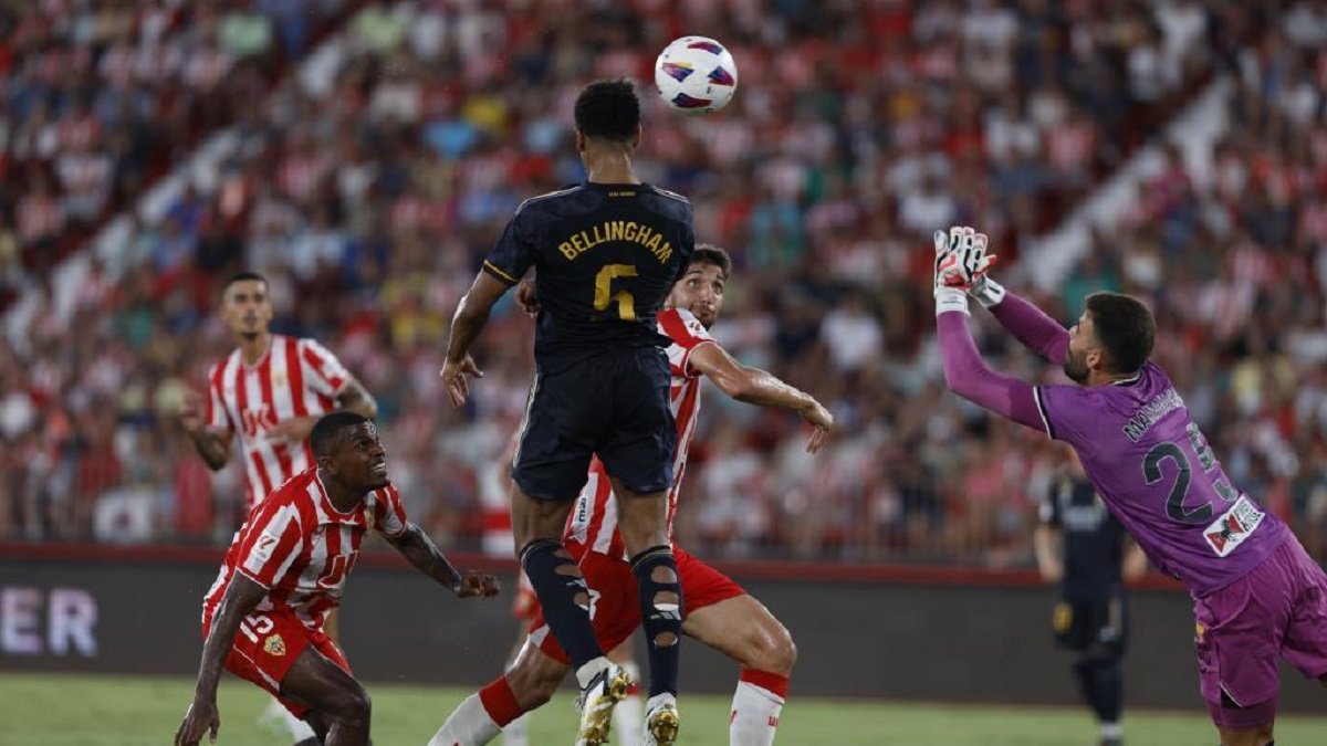 Лукас Робертоне після перерви так само всюди. І шукає паси для загострення (3 за неповну годину), і сам пробиває (5). Рамазані ножицями у падінні більш ефектно, ніж загрозливо, пробивав. Лунін розташувався по центру, куди й прилетів м'яч. Вінісіус претендує на пенальті та заробляє жовті для суперників. По 2-3 гравці Альмерії з допомогою рук зупиняють проходи бразильця, який більшою мірою страждає на позиції в центрі нападу. А виграє від відсутності класичного центрфорварда галактичний Беллінгем. Джуд вривається у штрафний під навіс земляка Крооса і випереджає воротаря.