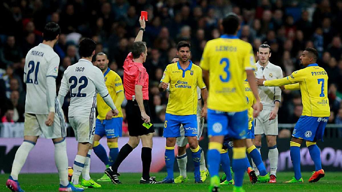 Протягом першого тайму канарці нічим не поступалися іменитому супернику. За ударами по воротах "Лас-Пальмас" був попереду: 9 проти 6. Першими забили "вершкові" – Іско реалізував вихід віч-на-віч з Хаві Варасом. Через дві хвилини Тана обіграв Серхіо Рамоса та щосили пробив по воротах, засмутивши трибуни "Сантьяго Бернабеу" – 1:1. Посеред першого тайму Дані Кастельяно ненароком травмував свого колегу Педро Бігаса, і замість центрального оборонця вийшов захисник Айтамі. Наприкінці першого тайму чудово у штрафному майданчику зіграв Лемос, не дозволивши відзначитися Мораті.