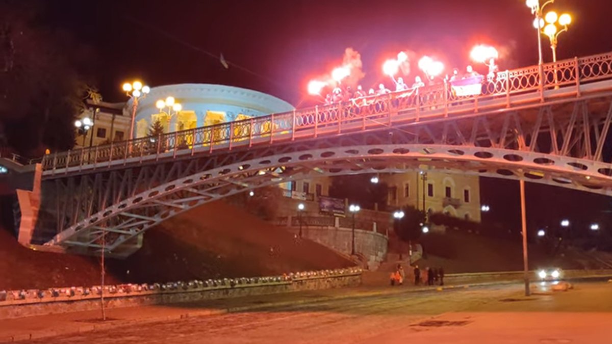 З десяток уболівальників вивісили на мосту по вулиці Інститутській синьо-жовтий і червоно-чорний прапори, запалили фаєри і співали патріотичних пісень. Все це дійство ультрас виклали на своїй сторінці в соціальній мережі YouTube.