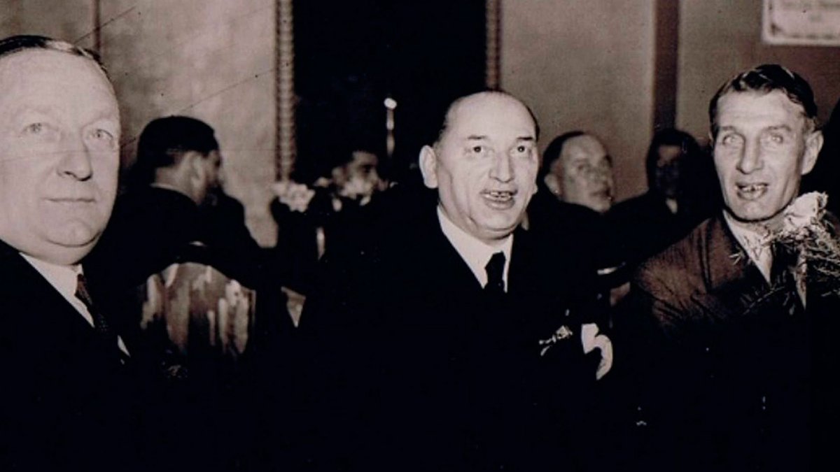 Сінделар і Науш дають інтерв’ю профессору Віллі Шмегеру перед матчем проти Шотландії в 1935 році