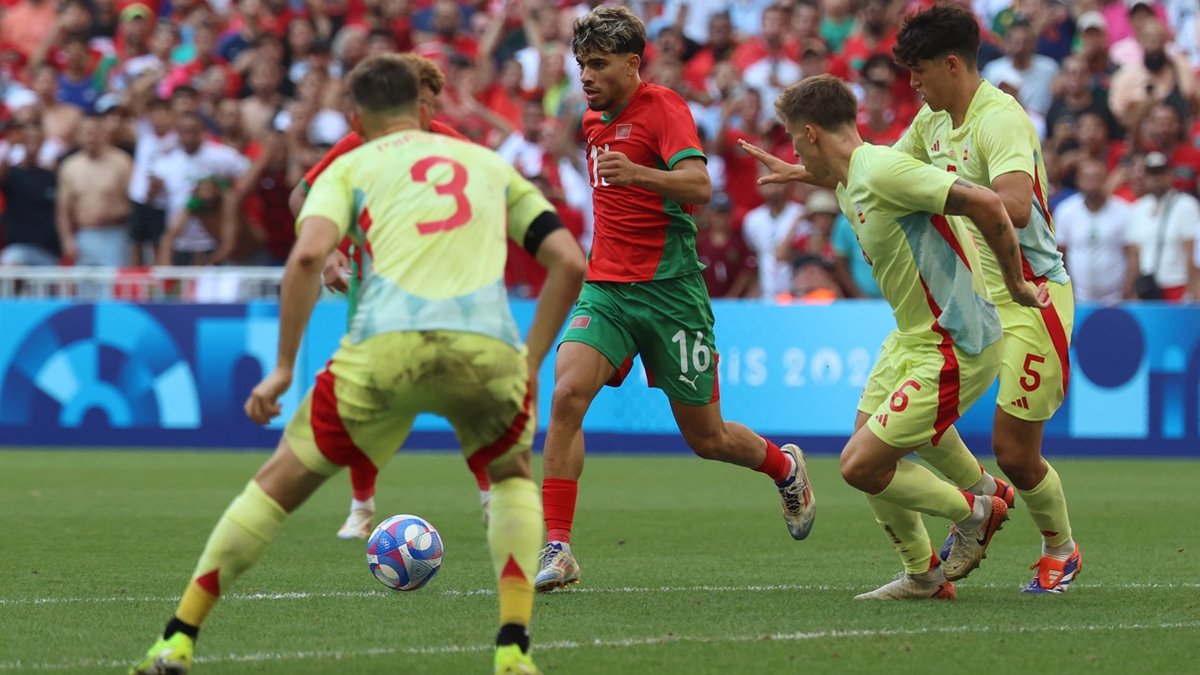 Гра між командами розпочалася активно, але на 13 хвилині виникла пауза через травму основного арбітра. Танташев не зумів продовжити гру, а його місце зайняв Нюберг. Іспанія мала невелику перевагу у моментах, але відкрити рахунок першими вдалося саме марокканцям. Барріос сфолив на Річардсоні у своєму штрафному майданчику. Арбітр після перегляду VAR призначив 11-метровий, який вдало реалізував Рахімі. Для Суф'яна гол став шостим на турнірі. Він вчетверте забив на Олімпіаді з пенальті.