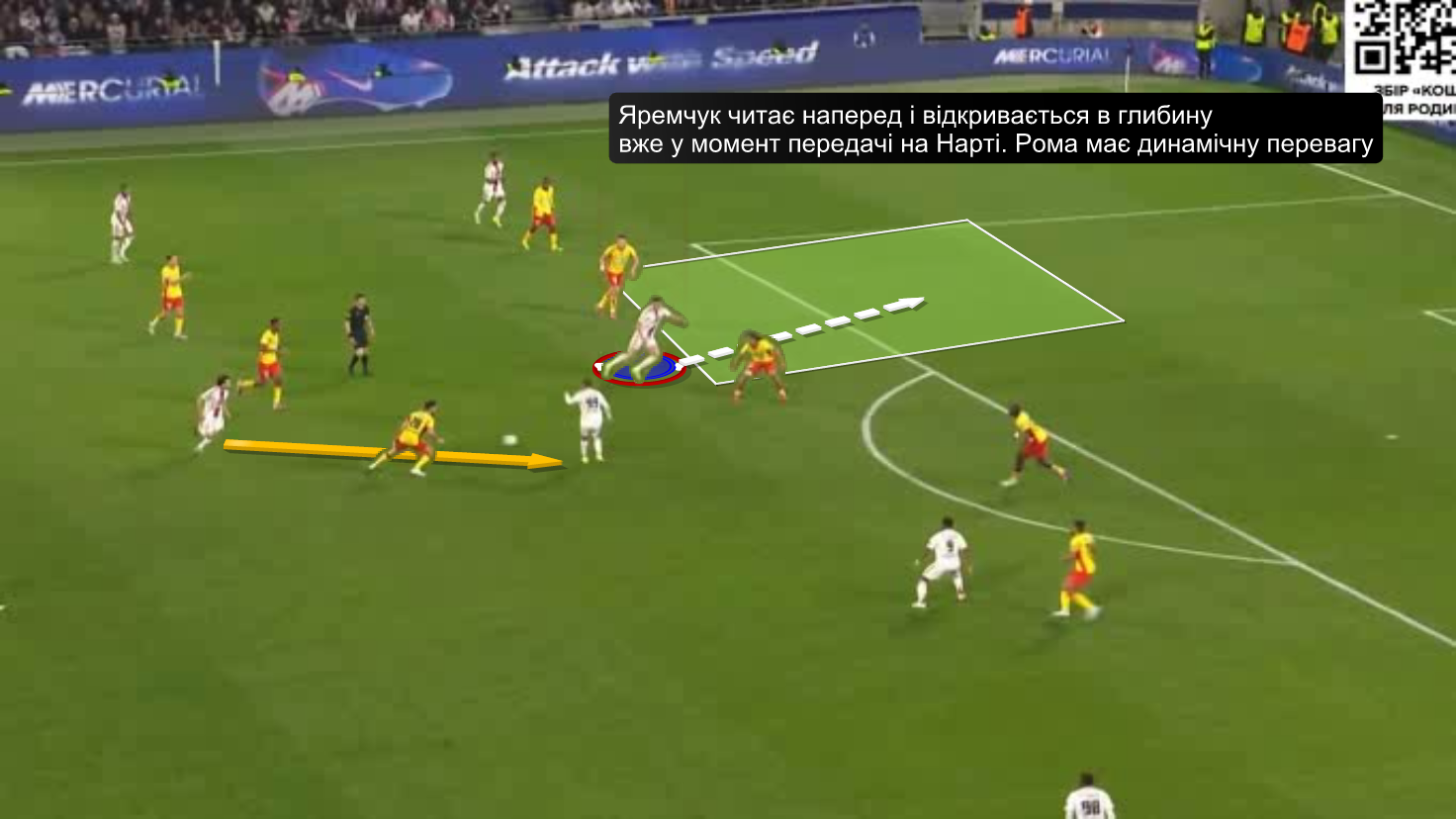 Ще за хвилину Яремчук відкривався під можливий пас Нарті за спину, однак той вирішив пробити з дистанції. Вийшло неточно. Знову можна побачити два відкривання за спини в одному епізоді, причому Роман біг у простір ще до приймання м'яча партнером.