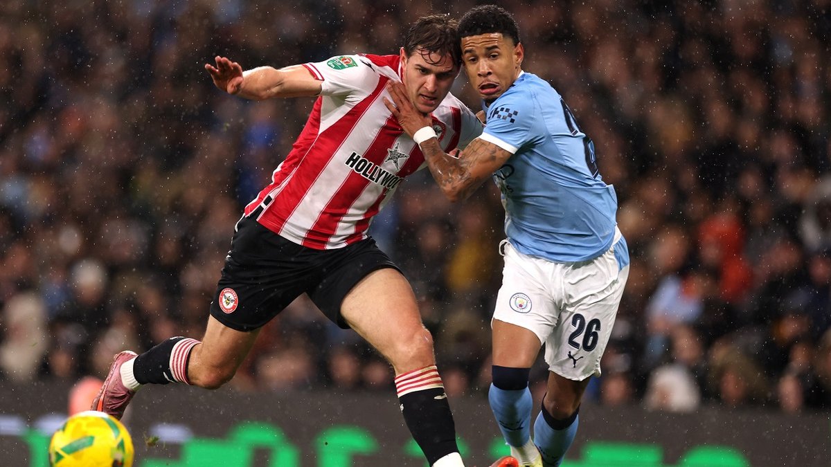Навіть проти такої версії "містян" Брентфорд діяв обережно. Гості зробили ставку на контратаки, і одна з них ледь не принесла чисельну перевагу на 16-й хвилині. Шаде після довгого закидання Аєра рвався на рандеву з воротарем, однак Хусанов зрубав німця. Цілком могла бути червона картка, однак рефері Семюел Беррот обмежився жовтою. VAR на цій стадії Кубка ліги немає, тож рішення польового судді остаточне.