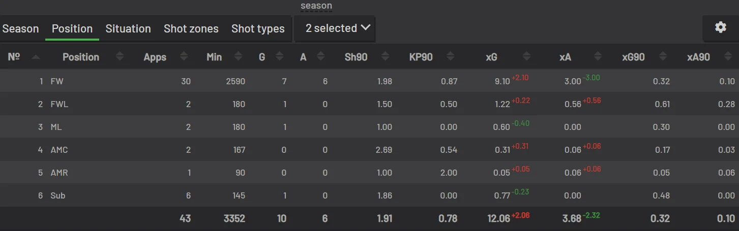 У нападі Брейтвейт може зіграти практично будь-де: форвард, вінгер, центральний атакувальний півзахисник – всюди Мартін працює без особливої втрати якості. Як ЦАП данець у Леганесі в середньому бив по воротах навіть частіше, ніж в ролі нападника. Сумарний xG поточного сезону за амплуа поділений приблизно порівну: 3,73 при грі форвардом й 2,18 на інших позиціях (все це без урахування виходу на заміну).