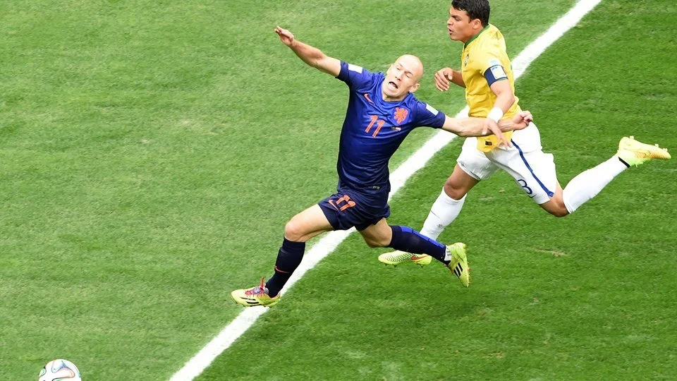 Рефері вказує на пенальті і дає бразильцю… жовту картку! У повторі чітко видно, що на Роббені порушили правила ще до штрафного майданчику, а оскільки це фол останньої надії, то потрібно було показувати червону.