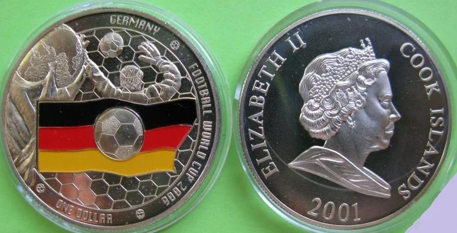 Розпочнімо з екзотики! Цей долар випущено монетним двором островів Кука. Одразу пригадуються слова класика: «Але чому аборигени з’їли Кука? За що - неясно, мовчить наука»... Так ось, цей «бакс» приурочений до Чемпіонату світу 2006-го року, що відбувся на полях Німеччини. Гарнезну монету з кольоровою емаллю, яку ви маєте змогу спостерігати, продають виключно в капсулі – а все тому, що зроблена вона в «пруфі», тобто має поліпшену технологію виготовлення, завдяки чому металеве кружальце може похизуватися чудовим дзеркальним блиском і абсолютно рівною досконалою поверхню без подряпинок, сколів чи бруду. Якщо ж на полі подібної монети ви при купівлі розгледите якійсь дефекти – можете сміливо збивати ціну!