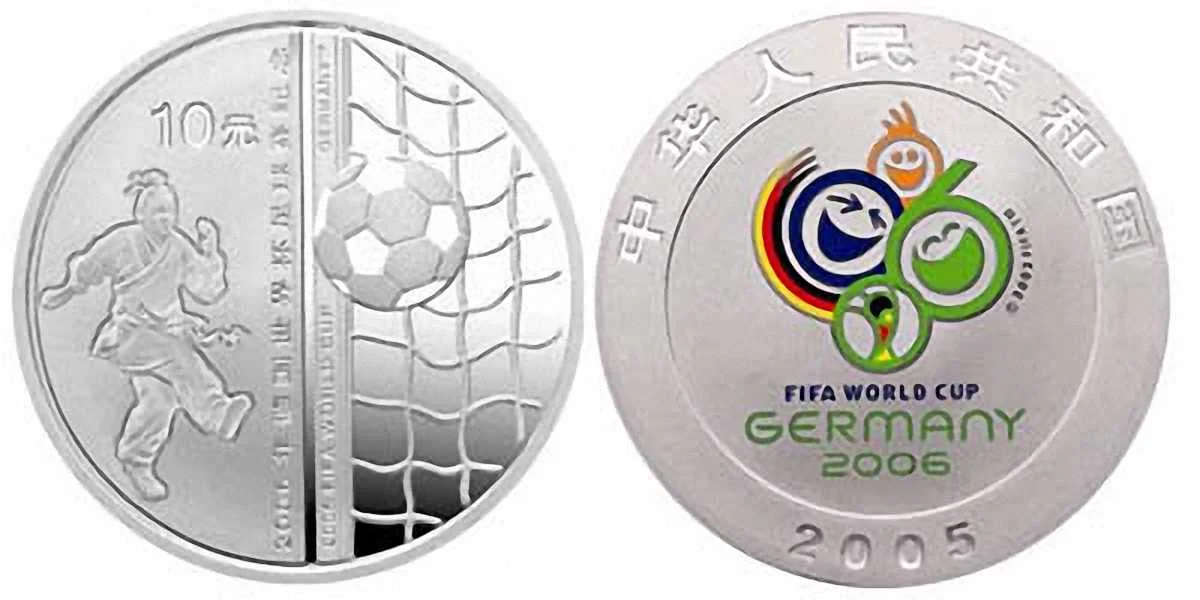 Наступний шедевр приїхав до нас із Китаю. Що ми на ньому бачимо? На реверсі колоритний чубатий самурай лупить по м’ячу (хоча в авторитетному каталозі Краузе він описується як «класичний гравець у футбол» - уявляєте такого красеня на полі?), а на аверсі зображено кольорову емблему німецького ЧС-2006. Дійсно, той Мундіаль - дуже популярна тема у нумізматичному світі!