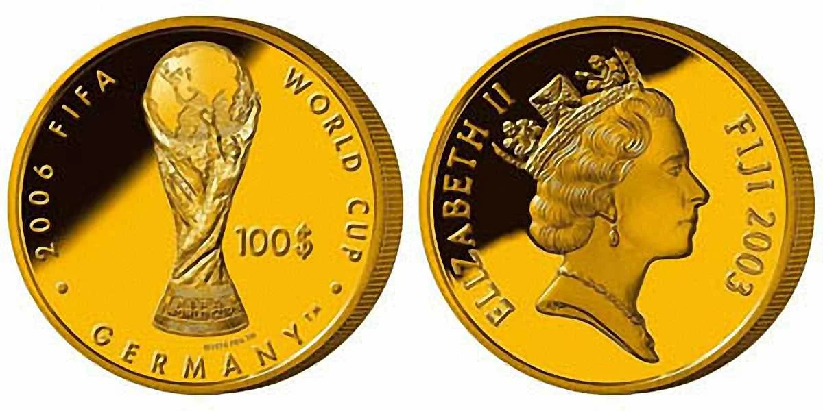 Лаконічна і дорога монета невеликої острівної країни Фіджі – ще один цікавий екземпляр нашого сьогоднішнього огляду. Золоті (цільних 8 грамів дорогоцінного металу!) сто доларів викарбовано у 2003 році до німецького Чемпіонату світу невеликим тиражем – у світі їх всього 25 тисяч штук, і будьте певні, що майже всі вони зараз знаходяться у приватних колекціях. Тому знайти таку вдасться хіба що на аукціоні, і коштувати вона буде як мінімум у декілька разів вище озвученої нами орієнтовної вартості.