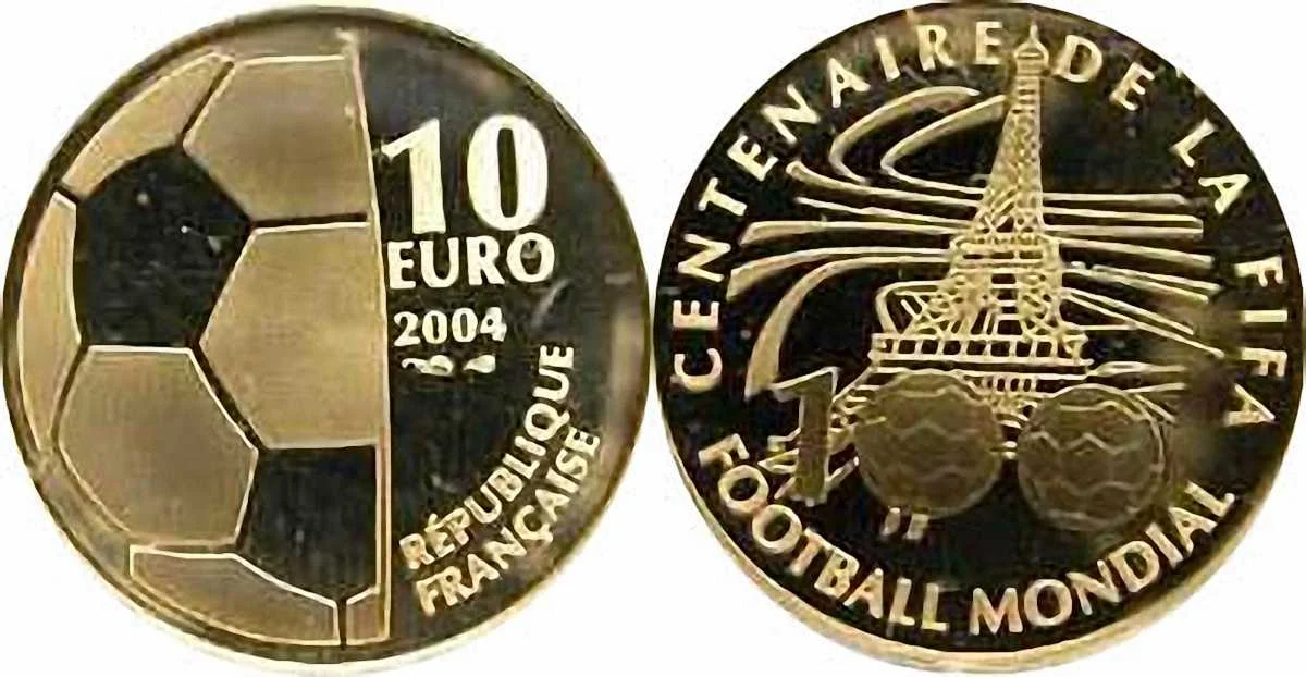Французи безсумнівно розуміються у монетах – взяти хоча б ці золоті 10 євро! Колоритна і презентабельна монетка, яку так і хочеться пощупати в руках, на момент виготовлення коштувала 265 євро. Зараз – сміливо множте на п’ять, і це у кращому випадку. А що ви хотіли, вона ж з нагоди сторіччя ФІФА випущена. А у ФІФА все недешево – ви тільки-но у Катару чи Росії спитайтеся…