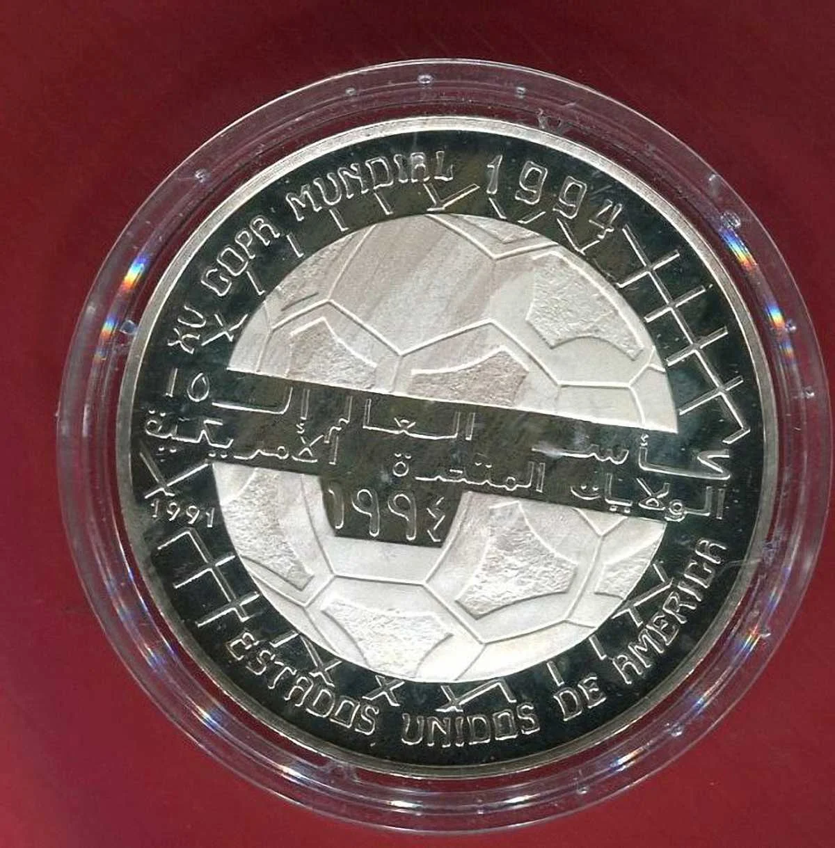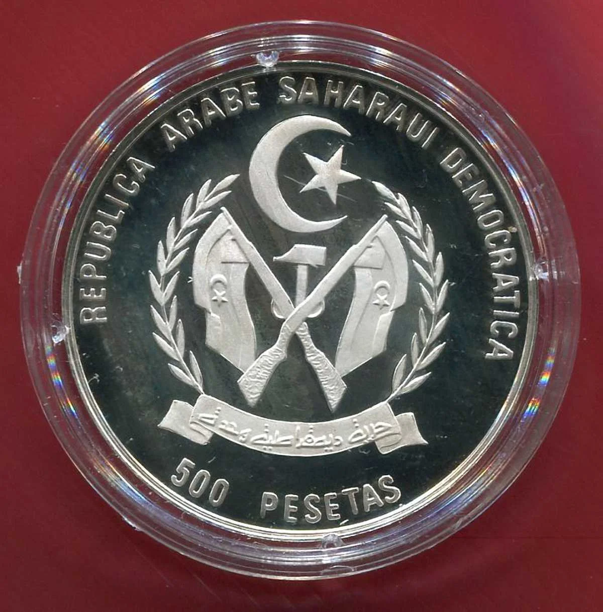 Дуже цікавий екземпляр! Монети самопроголошеної республіки, розташованої в північно-західній Африці по сусідству з Марокко – велика рідкість у нумізматичному світі. Набір звичайного обігового дріб’язку Сахараві коштує плюс-мінус 100 гривень, тому немаленьке ювілейне срібне кружальце, яке випустили до американського Мундіалю тиражем усього 15 тисяч штук, і затягує більш ніж на тисячу української валюти.