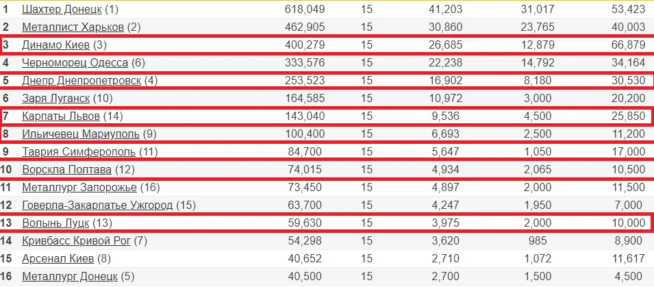 Відвідуваність у сезоні 2012/13 / таблиця проекту allplayers.in.ua