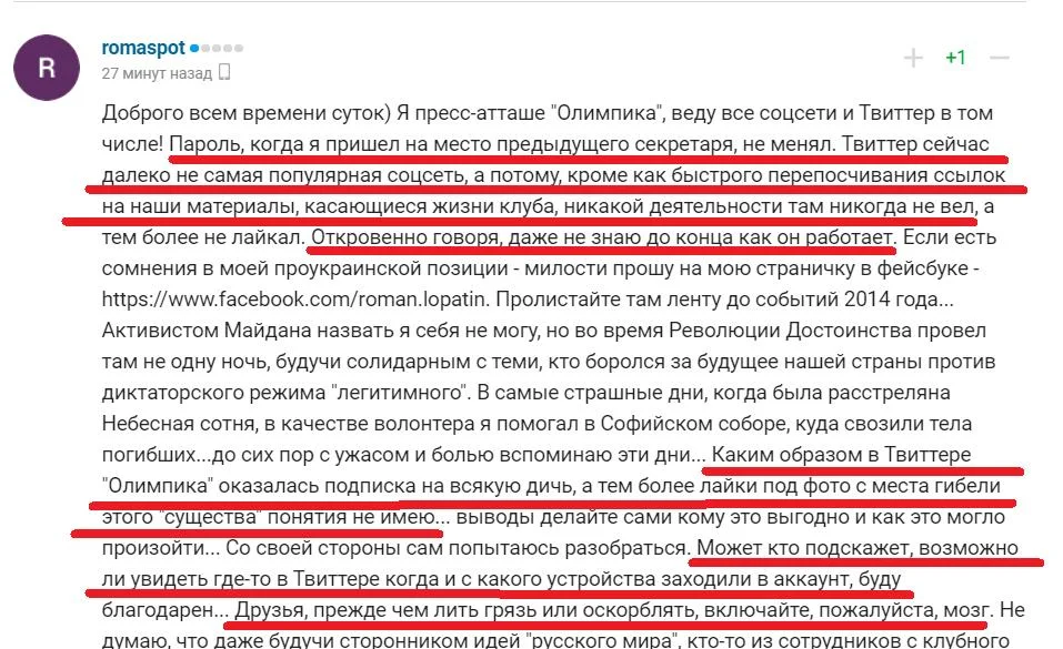 Восени ж 2019-го Олімпік оскандалився у своєму твіттері, який підписувався на пабліки т.з. "ДНР", репостив Раша Тудей і ставив лайки під постами зі скорботою по Олексію Захарченку. Виправдовуватись у коментарі зайшов новий прес-аташе. Рівень його професіоналізму говорить сам за себе: