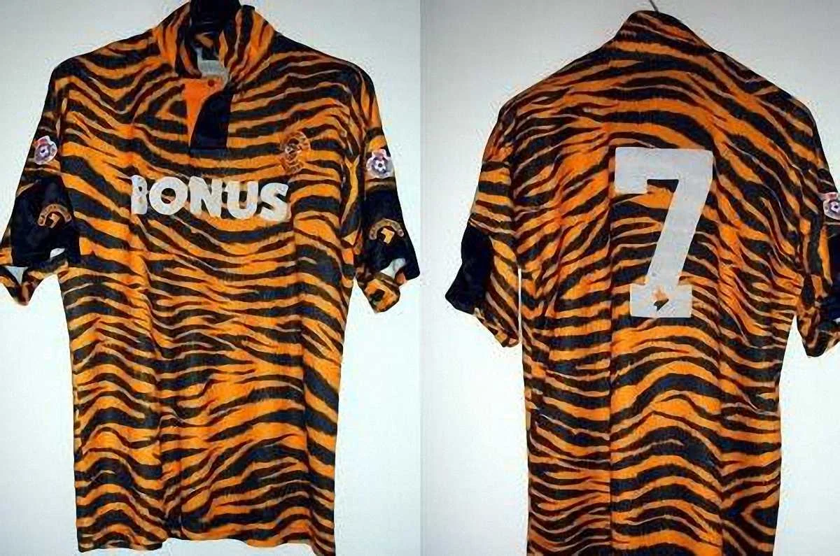 Форма англійського "Халл Сіті" 1993 року. Багато вболівальників знають прізвисько цієї команди - тигри. Мабуть хтось це зрозумів занадто буквально.