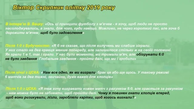 Віктор Скрипник приваблює своїм вмінням розмовляти з пресою. Важко згадати тренера УПЛ, який був настільки ж відкритим, інтелігентним і чесним у своїх інтерв’ю, однак навіть досвідчені журналісти не помічають суперечностей у його заявах. Суперечності самому собі – це нормально, але ненормально просто ігнорувати їх.