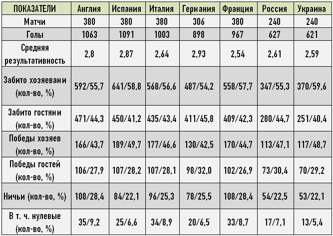 Відразу відзначимо, що метою аналізу не є визначення кращого турніру з тим чи іншим показникам, оскільки на будь-яку цифру можна поглянути з різних сторін. Наприклад, традиційно висока результативність Бундесліги може говорити як про майстерність гравців атаки, так і недоліки в оборонних порядках німецьких клубів.