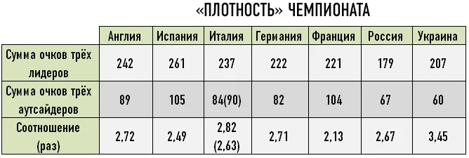 Для аналізу внутрішньої конкурентоспроможності клубів у лігах ми застосували термін "щільність" чемпіонату. Цей показник враховує співвідношення набраних очок клубів, що зайняли три перших і три останні місця в турнірній таблиці. Чим менше це співвідношення, тим наполегливіше йшла боротьба на верхніх і нижніх поверхах ліг. Як бачимо з таблиці, найбільш однорідним є чемпіонат Франції, тоді як різниця в класі клубів української ліги величезна. Інша картина в іспанському чемпіонаті: три явних лідери і висока конкуренція в таборі аутсайдерів, що видно по сумі очок, набраних на обох полюсах. Показники Серії А наведені як з урахуванням зняття з "Сієни" шести очок, так і без.