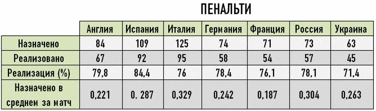 Більше всіх пенальті призначається в італійському і російському чемпіонатах, менше всіх у Франції та Англії. Краще за інших з реалізацією пенальті йдуть справи в Іспанії, гірше за інших в українському чемпіонаті, де навіть беззаперечний лідер донецький "Шахтар" забив всього чотири пенальті з семи призначених.