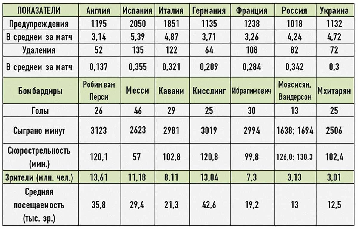 Розглянемо показники по жовтим і червоним карткам. Більше всіх попереджень в Іспанії та Італії, вилучень в тій же Іспанії та Росії. Менше всіх покарань обох видів в англійській прем'єр-лізі. Це не дивно. Всім відома різниця в методиці суддівства між Англією та Іспанією. Там, де британський арбітр тричі подумає, перш ніж винести покарання, іспанська до того часу встигне показати цілий букет карток. Зате в Англії прийнята практика винесення тривалих дискваліфікації, в основному за неспортивну поведінку.