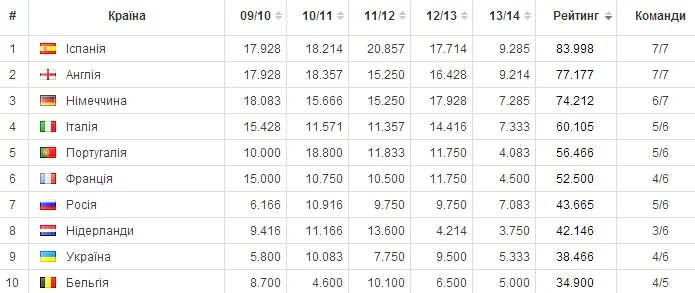 Додамо, що лідер клубного єврорейтингу Іспанія вийшла на перше місце по набору очок і цього сезону і зовсім небагато їм поступаються другі англійці.