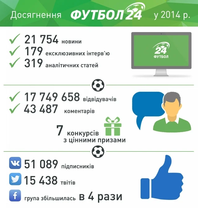 Попри важкі часи, в тому числі і в сфері спортивної інтернет-журналістики, редакція "Футбол 24" не збавляла своїх обертів, і наповну працювала для вас, наповнюючи сайт новинами, статтями, інтерв'ю, відео голів, проводячи конкурси та онлайни матчів. Ось, коротко, те, що ми у 2014 році зробили для вас: