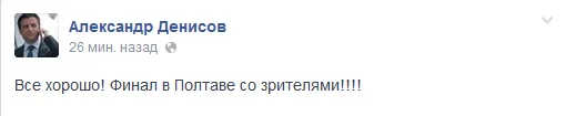 "Все добре! Фінал в Полтаві з глядачами!!!!", - написав Денисов у Facebook.