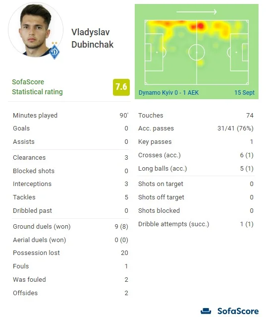 Лідер на полі серед обох команд за кількістю і відсотком виграних єдиноборств (8 з 9), за відбираннями (усі 5 спроб стали успішними) та перехопленнями (3). За винятком Циганкова і Буяльського, які від безсилля і немічності партнерів вже й самі ніби кинули грати під завісу зустрічі, лише одна людина була готова щось створювати сьогодні. Дубінчак недарма став гравцем матчу за версією статистичних порталів SofaScore і FotMob. Владислав не лише блискуче проявив себе в оборонній грі. Він став співавтором 2 найкращих моментів Динамо за всю гру, і лише нещасний випадок вкупі з прискіпливістю VAR та відсутністю центрфорварда позбавив його мінімум одного асисту, якщо не двох.