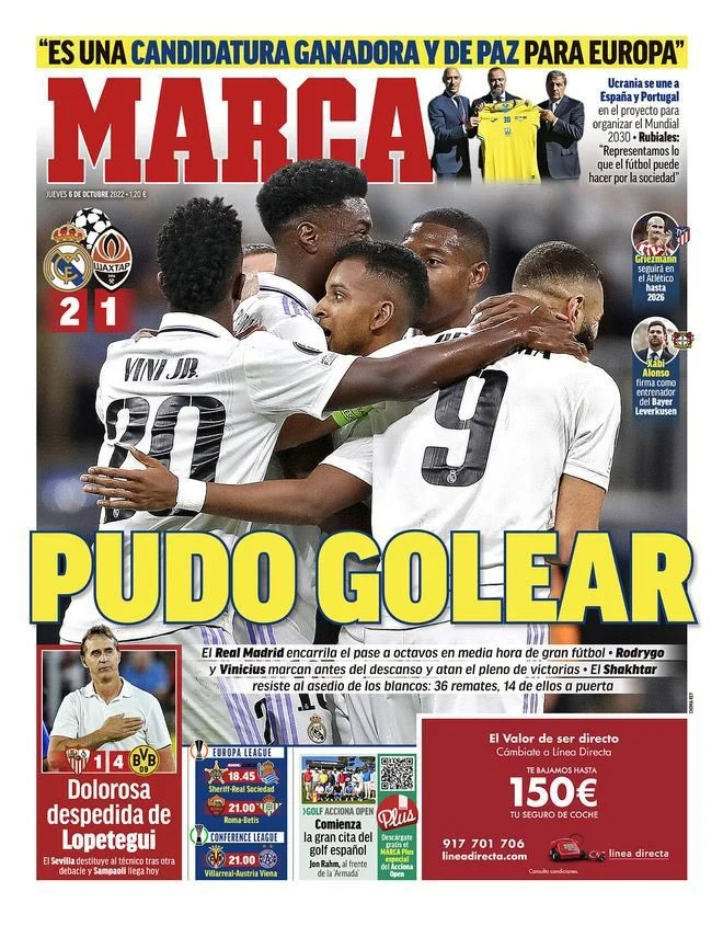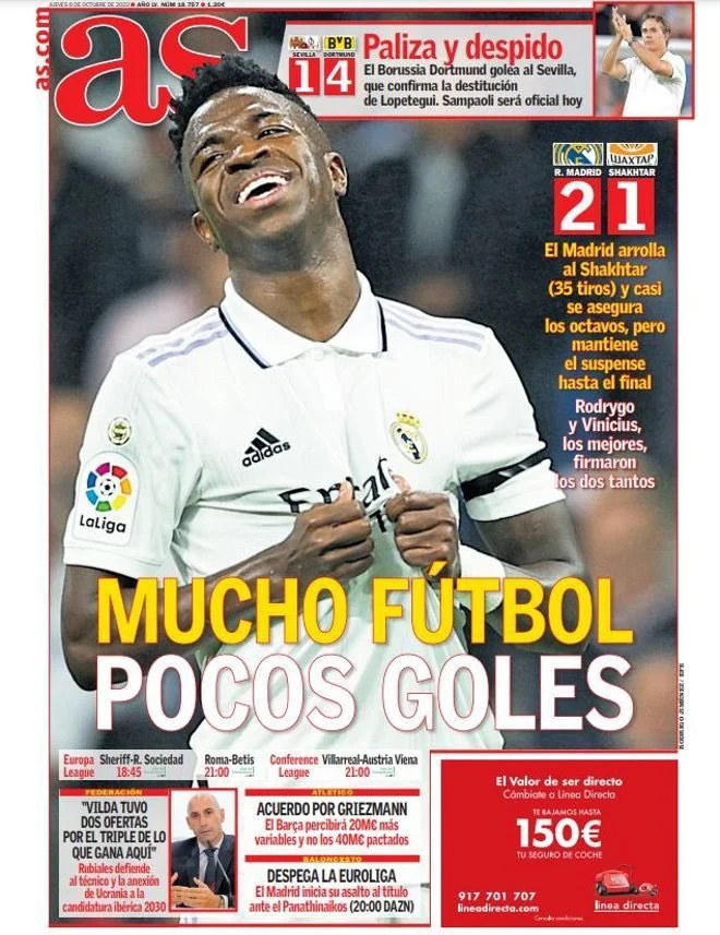 El Pais відзначає "аномальне явище" на Бернабеу. Оглядач найбільшої газети Іспанії Хосе Семано намагається зрозуміти, чому Реал забив лише 2 голи при 36-и ударах. Ба більше, він припускає, що матч міг завершитися нечуваним фіаско для мадридців, якби Мудрик реалізував фактично вихід віч-на-віч з Луніним. "Ми стали свідками чаклунства. Інакше неможливо пояснити стільки промахів у виконанні гравців Реала. Це саме той випадок, коли у футболі відсутня будь-яка логіка. Мадрид насолоджувався власною вечіркою, але ледь не поплатився за дуже слабку реалізацію".