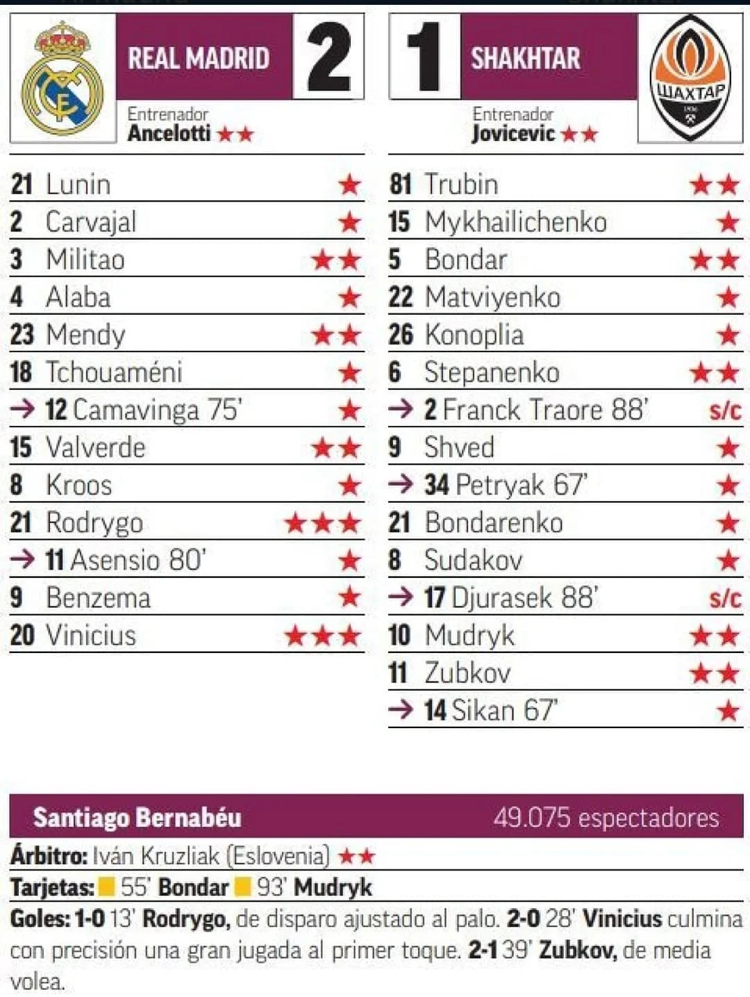 До слова, Marca не поскупилися на високі оцінки для українців: Степаненко, Бондар, Мудрик, Зубков і той же Трубін отримали по 2 бали з трьох можливих. Найкращими ж гравцями матчу прогнозовано визнали Віні та Родріго (у обох – трійки). Наш Андрій Лунін (1) іспанців не вразив, хоча з ударом Зубкова навряд чи впорався б сам Куртуа.