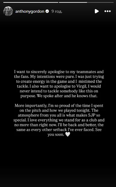 Що ще важливіше, я дуже пишаюся тим, як ми грали сьогодні ввечері. Атмосфера, яку створили вболівальники, робить Сент-Джеймс Парк особливим. Я люблю цей клуб і повернуся кращим. До зустрічі", – написав Ентоні Гордон в Instagram.