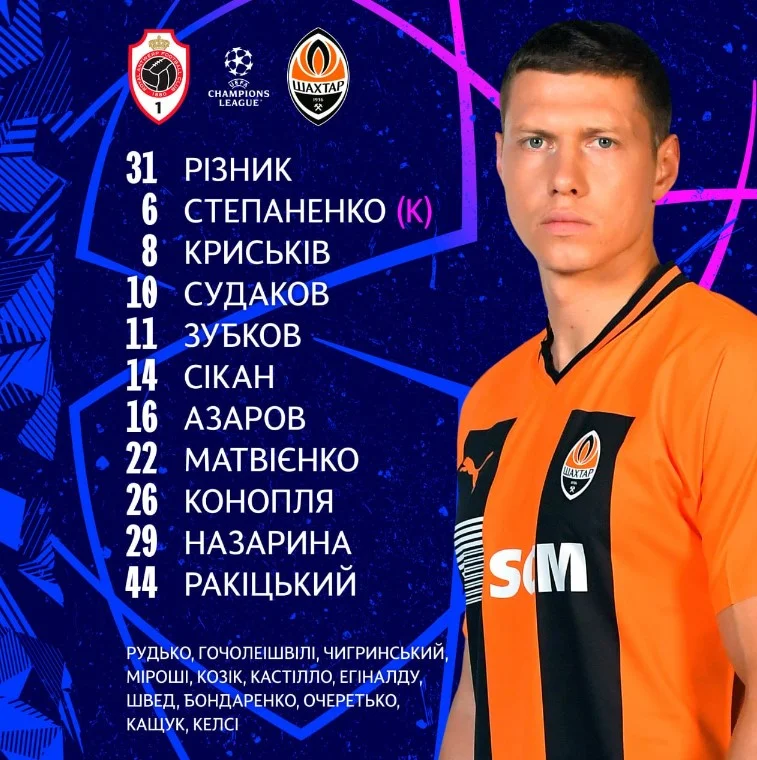 Шахтар: Різник – Конопля, Ракицький, Матвієнко, Азаров – Степаненко – Зубков, Назарина, Судаков, Криськів – Сікан