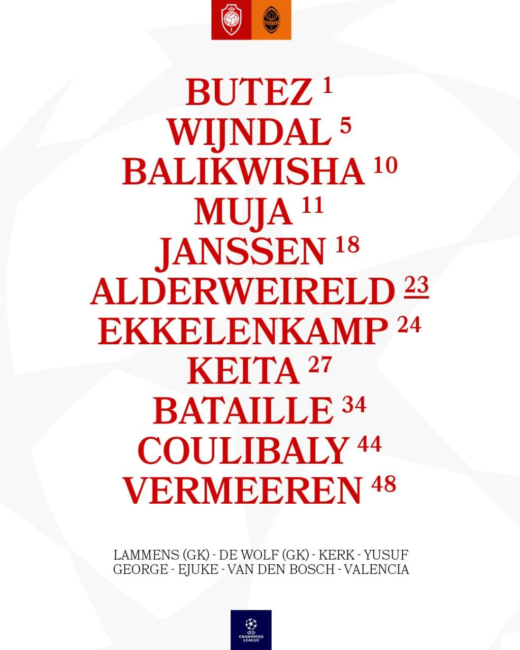 Антверпен: Бюте – Батай, Алдервейрельд, Кулібалі, Війндал – Вермерен, Кейта, Еккеленкамп – Муйя, Янссен, Баліквіша